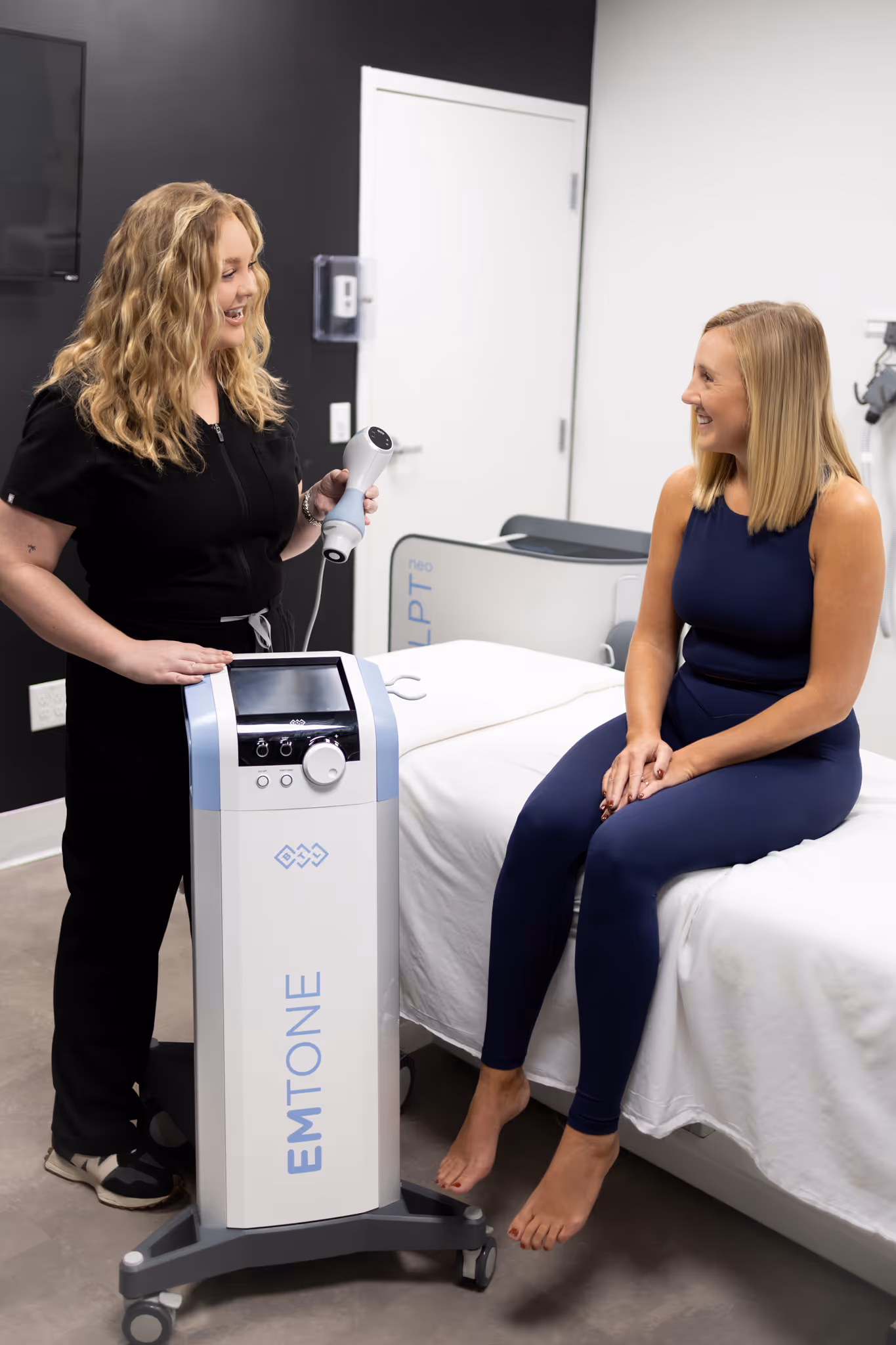 Emtone relies on acoustic sound waves to stimulate circulation and release built-up fluid. It also uses radiofrequency and targeted pressure energy to strengthen the bands that fat comes up through while heating the fat cells, tightening the skin, and stimulating the generation of new collagen. By targeting a lack of collagen, fluid build-up, and poor circulation – three major factors contributing to cellulite – Emtone achieves results with these combined technologies that they couldn’t achieve alone.